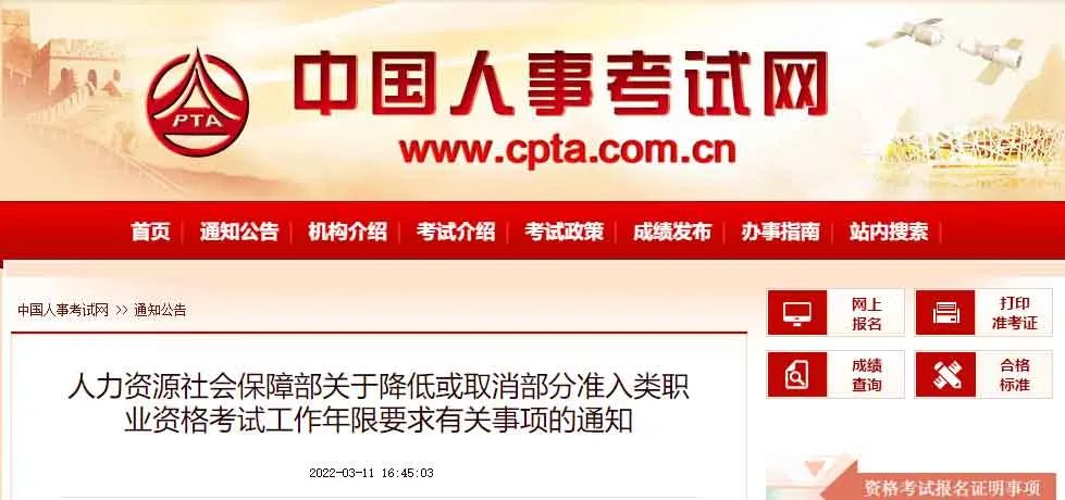終于來了!人社部正式發布《人力資源社會保障部關于降低或取消部分準入類職業資格考試工作年限要求有關事項的通知》,自2022年起實施。