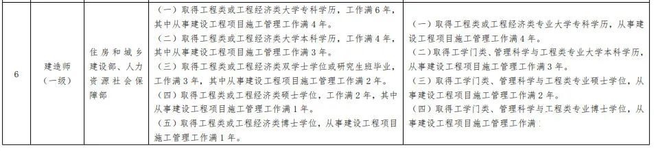 (一)取得工程類或工程經濟類大學專科學歷,工作滿6年,其中從事建設工程項目施工管理工作滿4年。
