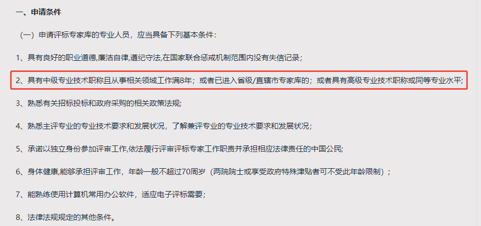 2、具有中級專業技術職稱且從事相關領域工作滿8年;或者已進入省級/直轄市專家庫的;或者具有高級專業技術職稱或同等專業水平;