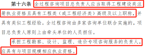 此前,福建省住建廳印發《福建省房屋建筑和市政基礎設施項目工程建設全過程咨詢管理規定(試行)》的通知,要求全過程咨詢項目總負責人應當取得工程建設類注冊執業資格(比如一建、一造證書等)且具有工程類(或工程經濟類)高級及以上職稱自2025年5月1日起執行,有效期3年。