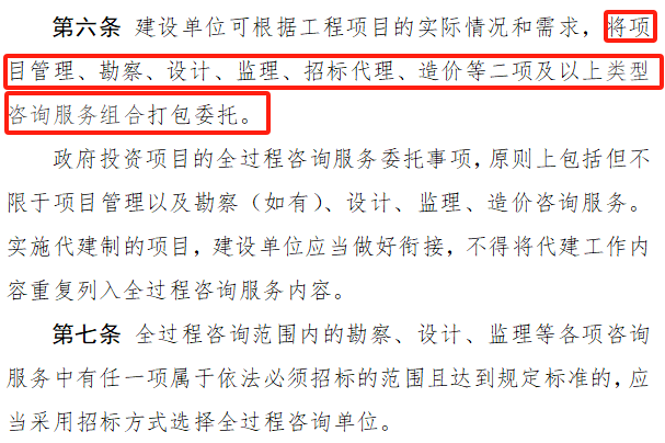 建設單位可根據工程項目的實際情況和需求,將項目管理以及勘察、設計、監理、招標代理、造價等咨詢服務全部或部分打包委托。