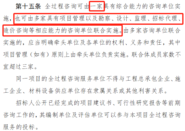 全過程咨詢可由一家具有綜合能力的咨詢單位實施,也可由多家分別具有項目管理以及勘察、設計、監理、招標代理、造價咨詢等相應能力的咨詢單位聯合實施。聯合體成員家數不宜超過三家。