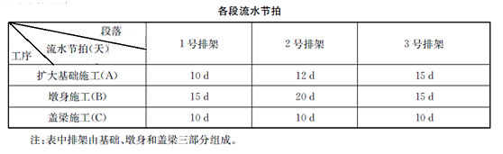 某施工單位承接了一4×20m簡支梁橋工程。橋梁采用擴大基礎,墩身平均高10m。項目為單價合同,且全部鋼筋由業主提供,其余材料由施工單位自采或自購。在離本工程不遠的江邊有豐富的砂源,經檢驗,砂的質量符合要求。采砂點位于一跨江大橋下游150m處,施工用砂均取自這里。項目部擬就1~3排架組織流水施工,如下表所示。