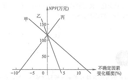 解析:本題考查敏感性分析。題中給出敏感性分析圖。圖中橫軸代表各不確定因素變動(dòng)百分比,縱軸代表評(píng)價(jià)指標(biāo)(以財(cái)務(wù)凈現(xiàn)值為例)。根據(jù)原來(lái)的評(píng)價(jià)指標(biāo)值和不確定因素變動(dòng)后的評(píng)價(jià)指標(biāo)值,畫出直線。這條直線反映不確定因素不同變化水平時(shí)所對(duì)應(yīng)的評(píng)價(jià)指標(biāo)值。每一條直線的斜率反映技術(shù)方案經(jīng)濟(jì)效果評(píng)價(jià)指標(biāo)對(duì)該不確定因素的敏感程度,斜率越大敏感度越高。一張圖可以同時(shí)反映多個(gè)因素的敏感性分析結(jié)果。