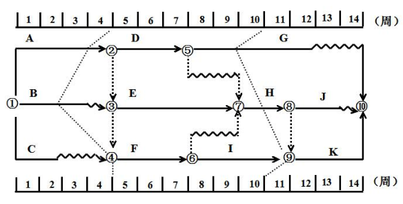 94.某工程項目的雙代號時標網絡計劃圖,當計劃執行到第 4 周末及第 10 周末時,檢查得出實際進度前鋒線如下圖所示,檢查結果表明()。