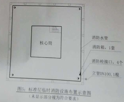“在建工程施工防火技術(shù)方案”中,對已完成結(jié)構(gòu)施工樓層的消防設(shè)施平面布置設(shè)計見圖5。圖中立管設(shè)計參數(shù)為:消防用水量15L/s,水流速ⅰ=15m/s;消防箱包括消防水槍、水帶與軟管。監(jiān)理工程師按照《建筑工程施工現(xiàn)場消防安全技術(shù)規(guī)范》(GB50720-2011)提出了整改要求。