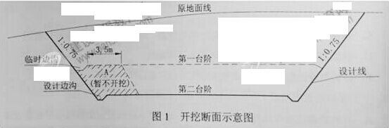 某施工單位承接了某丘陵區(qū)一級公路路基施工任務。施工單位編制了路基施工組織設計,并對施工組織設計進行了優(yōu)化,重點優(yōu)化了施工方案,主要包括施工方法的優(yōu)化、施工作業(yè)組織形式的優(yōu)化、施工勞動組織的優(yōu)化。技術人員根據(jù)路基橫斷面計算出土石方的“斷面方數(shù)”, 經(jīng)復核后,進行土石方縱向調(diào)配。調(diào)配時考慮到技術經(jīng)濟條件,盡量在經(jīng)濟合理的范圍內(nèi)移挖作填,使路塹和路堤中土石方數(shù)量達到平衡,減少了棄方與惜方。全標段路基挖方土質(zhì)為普通土,平均運距50m的土方有150000m³,平均運距200m的土方有100000m³,平均運距3000m的土方有80000m³ K5+630~K5+810的平均挖方深度7m左右,施工單位采用的某一開挖斷面示意如圖1,要求上下錯臺同時掘進。