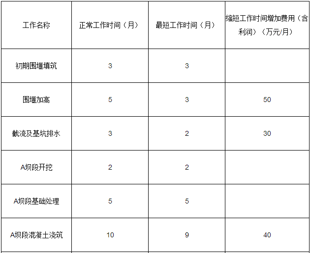 事件一:由于發(fā)包人未按時提供施工場地,造成了開工時間推遲,導(dǎo)致“初期圍堰填筑”的延誤,經(jīng)測算“初期圍堰填筑”要延至2012年1月30日才能完成。承包人據(jù)此向監(jiān)理人遞交了索賠一項通知書,后經(jīng)雙方協(xié)商達成如下事項:(1)截流時間推遲到2012年2月1日;(2)“圍堰加高”須在2012年5月30日(含5月30日)前完成;(3)完工日期不變,調(diào)整進度計劃;(4)發(fā)包人依據(jù)工期—費用表(如表2所示),重新編制新的施工進度計劃,并提交了趕工措施和增加的費用,上報監(jiān)理人并批準。