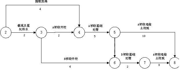 事件三:結(jié)合現(xiàn)場及資源情況,承包人對新的施工進度計劃進行了局部調(diào)整,A壩段采用搭接施工,其單代號搭接網(wǎng)絡(luò)如圖2-2所示: