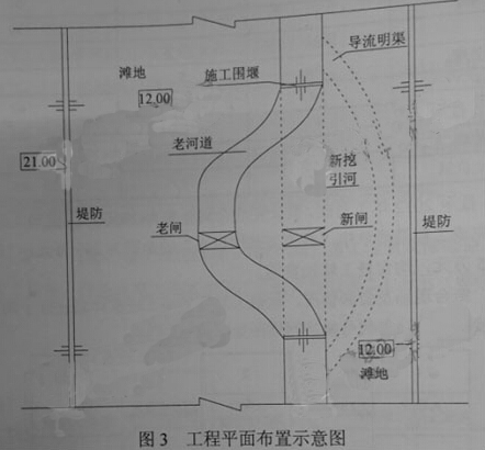 事件一:施工單位根據(jù)本工程具體條件和總體進度計劃安排,提出的施工導(dǎo)流方案如圖3所示。工程附近無現(xiàn)有河道可供施工導(dǎo)流,施工單位采用的導(dǎo)流方案為一次攔斷河床(全段)圍堰法施工,具體施工組織方案是在一個非汛期施工完成擴建新閘和加固老閘,在新閘和老閘上、下游填筑施工圍堰,期間利用新挖導(dǎo)流明渠導(dǎo)流。監(jiān)理單位審核后,認為開挖導(dǎo)流明渠工程量較大,應(yīng)結(jié)合現(xiàn)場條件和總體工期安排,優(yōu)化施工導(dǎo)流方案和施工組織方案。