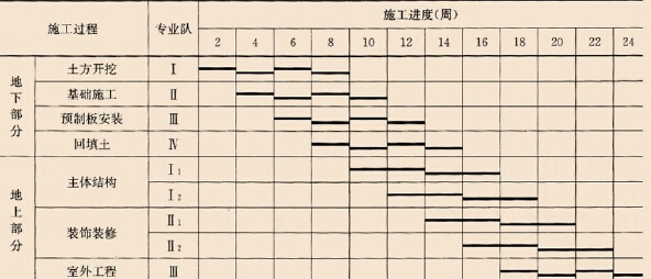 工期 T 地下=(M+N-1)×K=(4+9-1)×2=24 周