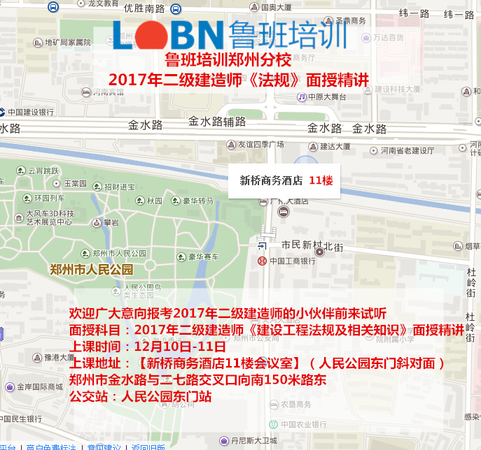 上課地址:【新橋商務(wù)酒店11樓會(huì)議室】鄭州市金水路與二七路交叉口向南150米路東(人民公園東門斜對(duì)面)