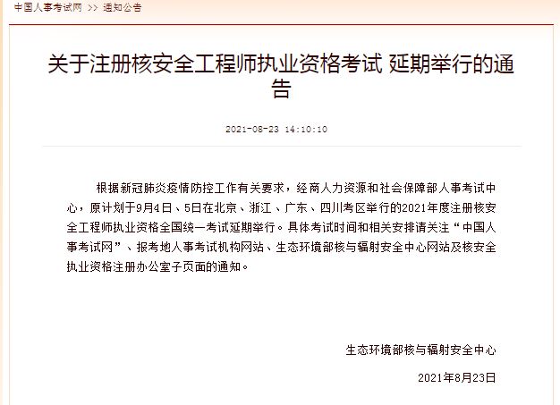 根據(jù)新冠肺炎疫情防控工作有關(guān)要求,經(jīng)商人力資源和社會保障部人事考試中心,原計(jì)劃于9月4日、5日在北京、浙江、廣東、四川考區(qū)舉行的2021年度注冊核安全工程師執(zhí)業(yè)資格全國統(tǒng)一考試延期舉行。具體考試時(shí)間和相關(guān)安排請關(guān)注“中國人事考試網(wǎng)”、報(bào)考地人事考試機(jī)構(gòu)網(wǎng)站、生態(tài)環(huán)境部核與輻射安全中心網(wǎng)站及核安全執(zhí)業(yè)資格注冊辦公室子頁面的通知。