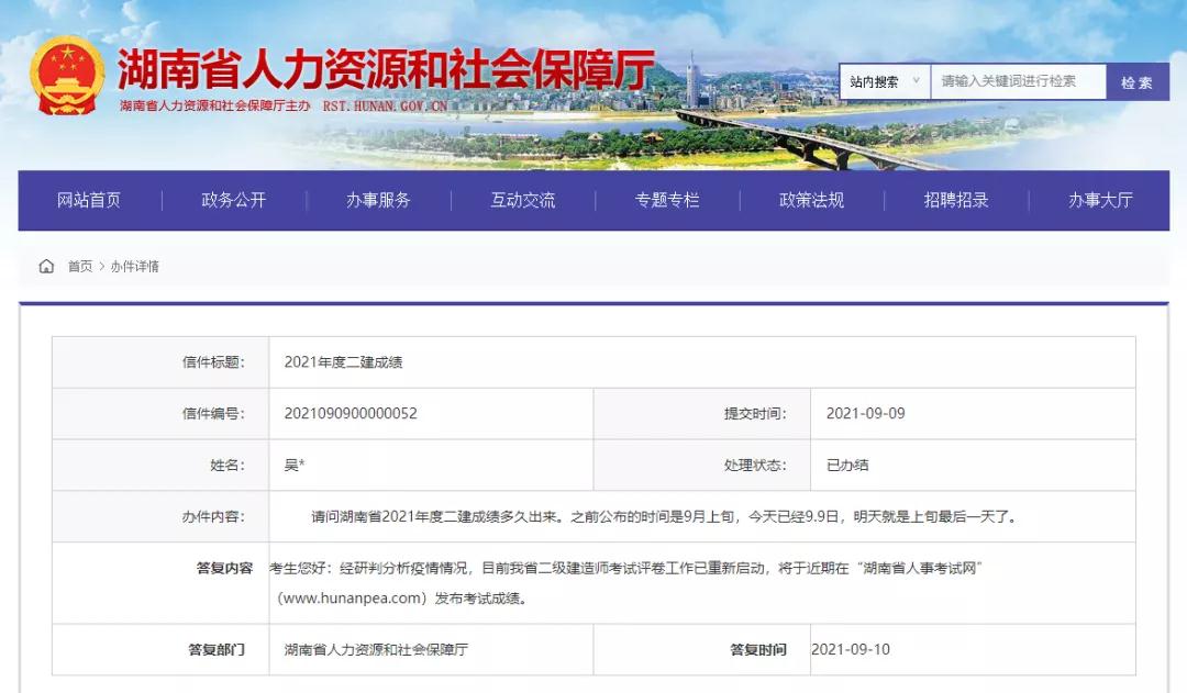 請問湖南省2021年度二級建造師成績多久出來。之前公布的時間是9月上旬,今天已經9.9日,明天就是上旬最后一天了。
