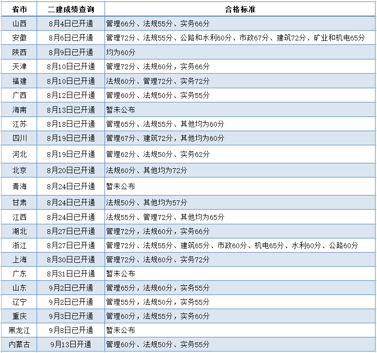 湖南二級建造師成績發布指日可待,湖南的考生再等幾日就可以查分了!截止目前,共有23地二級建造師成績可查,19地公布合格標準,匯總如下。