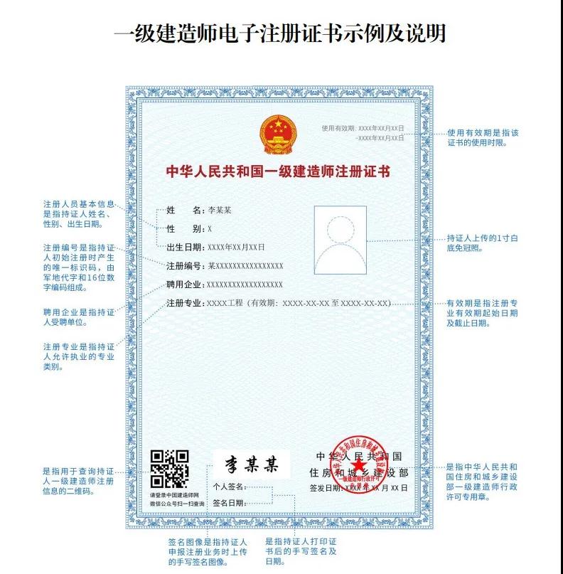 1.自 2021年10月15日起,在全國范圍內實行一級建造師電子證書(具體示例及說明見附件1),電子證書式樣按照《全國一體化在線政務服務平臺電子證照一級建造師注 冊證書》標準執行(具體式樣見附件2)。自 2022年1月1日起,一級建造師統一使用電子證書,紙質注冊證書作廢。