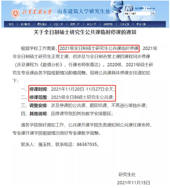 2020年11月6日,山東建筑大學發布《關于研究生公共課臨時停課的通知》,其中停課時間:2020年11月20下午—11月27日全天。