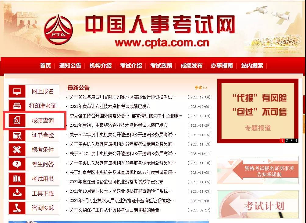 登錄中國人事考試網http://www.cpta.com.cn/index.html,點擊【成績查詢】