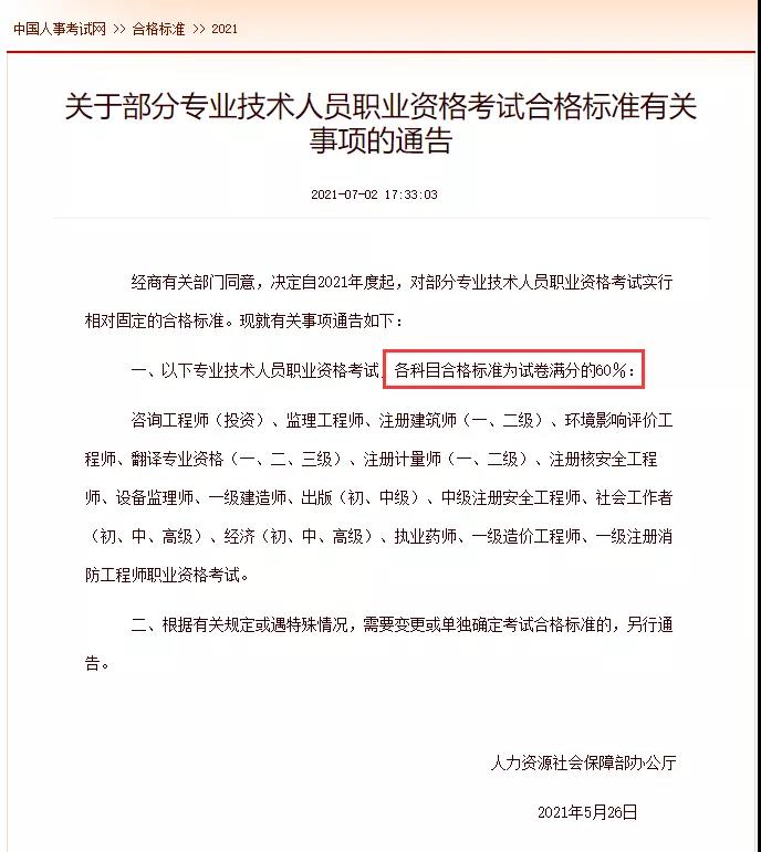 中國人事考試網發布了《關于部分專業技術人員職業資格考試合格標準有關事項的通告》對部分專業技術人員職業資格考試實行相對固定的合格標準,其中一級造價工程師合格標準還是為試卷滿分的60%