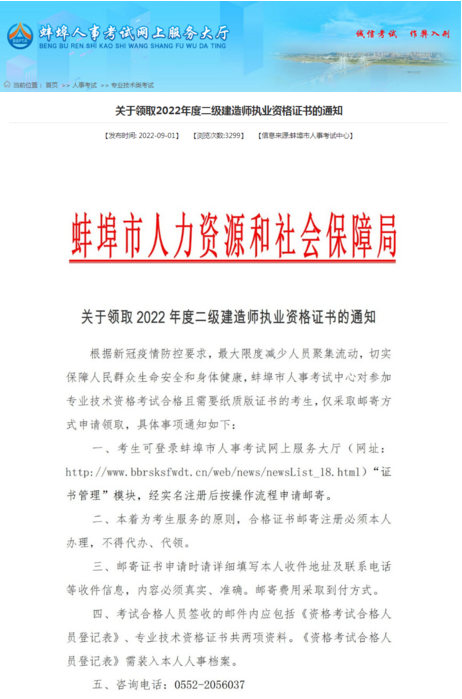安徽蚌埠二建領證通知已發,考生可以登錄人事考試網上服務大廳,經實名注冊后申請郵寄。