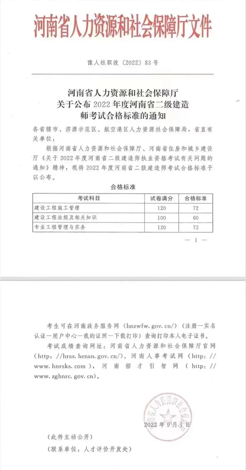22年河南二建合格標準為:管理72分,法規60分,實務72分。