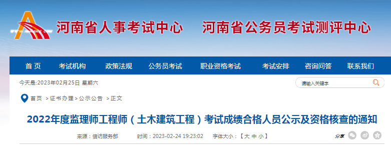 昨日:河南人事考試網發布了《2022年度監理師工程師(土木建筑工程)考試成績合格人員公示及資格核查的通知》,通知要求對2022年度注冊監理師工程師(土木建筑工程)考試成績合格人員予以公示和考后資格核查,資格核查時間安排為2023年2月24日至2022年3月2日,請考試成績合格人員務必于2023年3月1日前登錄網址http://222.143.32.83:9022/,注冊后按提示要求上傳相關資料,之后請關注平臺審核進度,在公示期間請保持手機暢通。