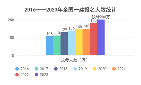 從2019年以后,全國每年大約有150萬人報考一級建造師考試,而且近年報考人數一直呈現出增長趨勢。22年報名人數約180萬,今年考一建的人數陡增,預計能突破200萬人!