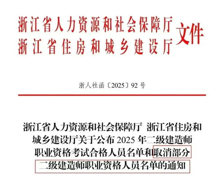 近日,浙江省人力資源和社會保障廳、浙江省住房和城鄉建設廳聯合發布《關于公布2025年二級建造師職業資格考試合格人員名單和取消部分二級建造師職業資格人員名單的通知》(浙人社函 [2025] 92號),明確對2022、2023、2024三個年度的189名二級建造師考生作出處理——取消考試成績、收回已發證書