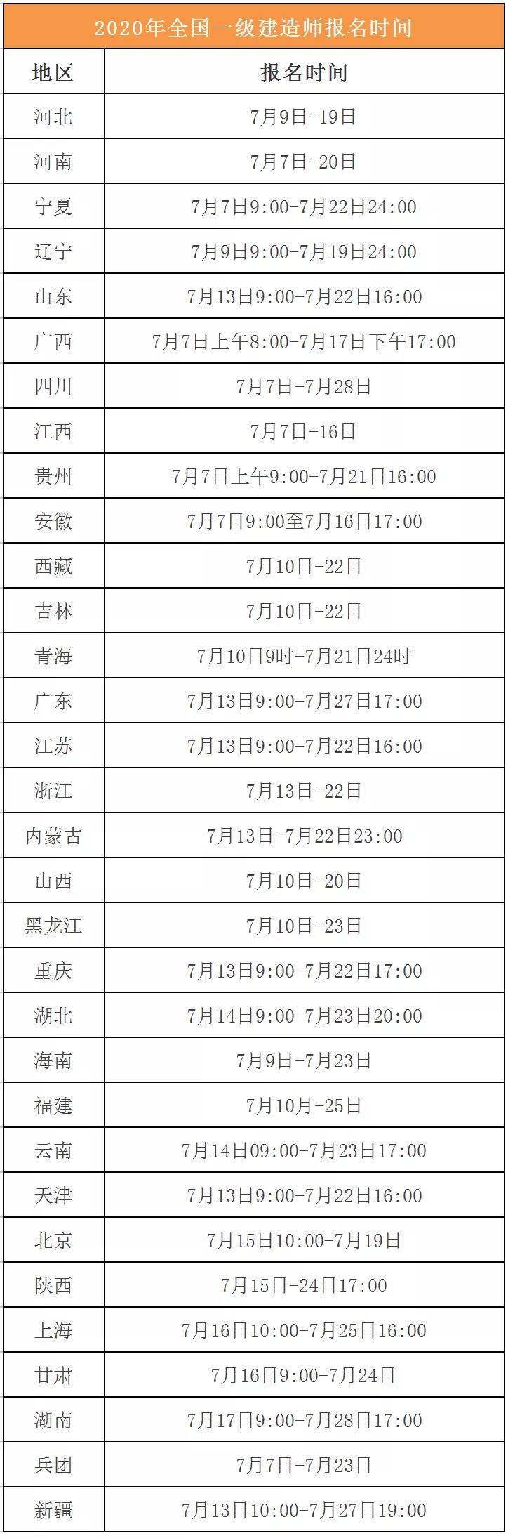 下面是2020年一建各省份報(bào)名時(shí)間匯總表,給大家作為一個(gè)參考。