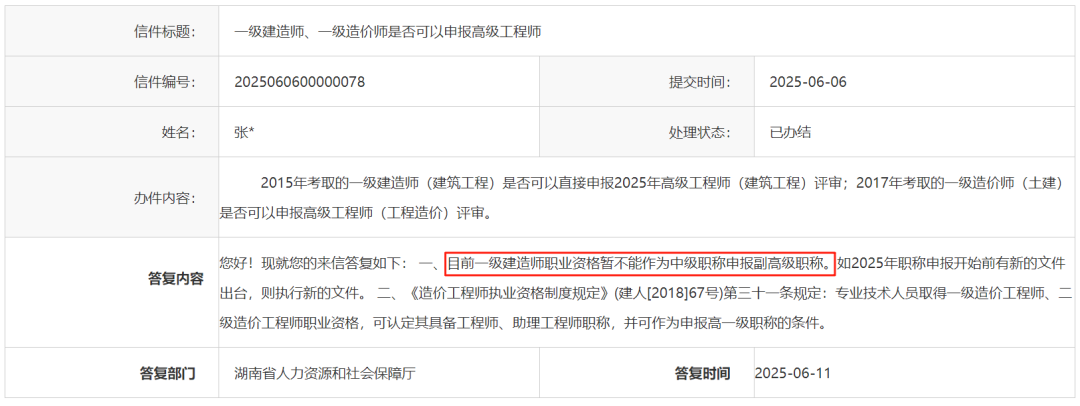 此外,湖南省人社廳也明確二級建造師職業資格暫不能作為初級職稱申報中級職稱。
