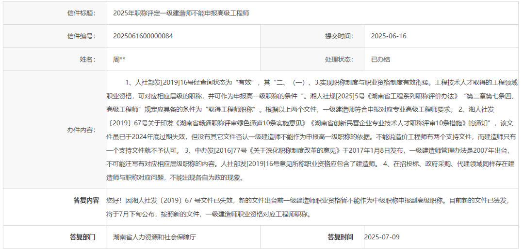 2、湘人社發〔2019〕67號關于印發《湖南省暢通職稱評審綠色通道10條實施意見》《湖南省創新民營企業專業技術人才職稱評審10條措施》的通知”,該文件雖已于2024年底過期失效,但沒有其它文件否認一級建造師不能作為申報高一級職稱的依據。不能說造價工程師有兩個支持文件,而建造師只有一個支持文件就不予認可。