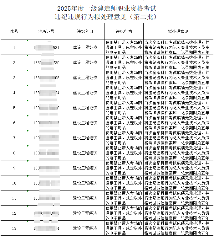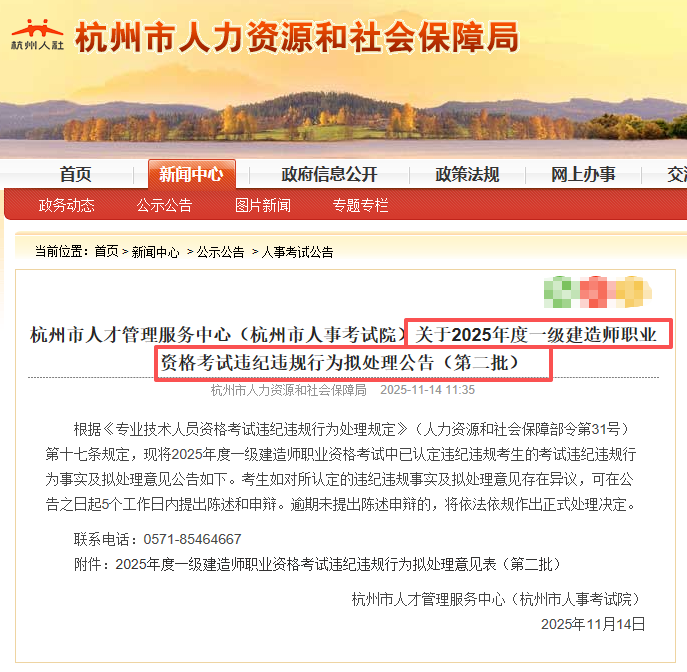 近日,浙江杭州發布關于《2025年度一級建造師職業資格考試違紀違規行為擬處理公告(第二批)》。