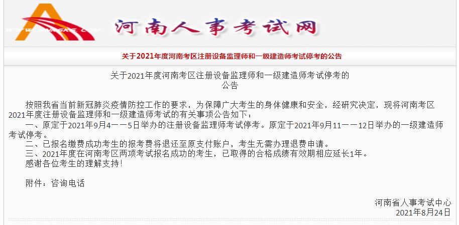 一、原定于2021年9月4——5日舉辦的注冊設備監理師考試??肌Tㄓ?021年9月11——12日舉辦的一級建造師考試停考。