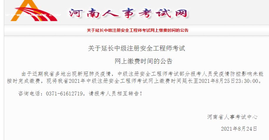 由于近期我省多地出現新冠肺炎疫情,中級注冊安全工程師考試部分報考人員受疫情防控影響未能按時完成繳費,現將我省2021年中級注冊安全工程師考試網上繳費時間延長至2021年8月25日23:30:00。