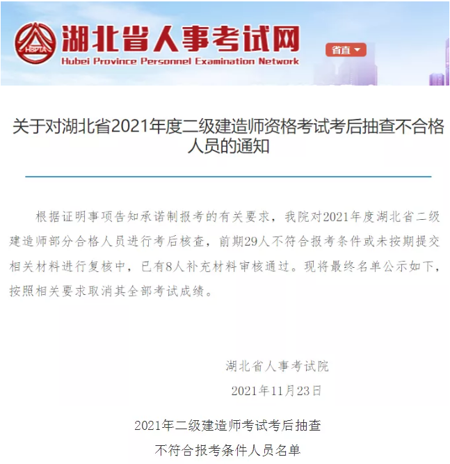 湖北二級建造師考后抽查結束:21人全部考試成績取消核查不通過原因如下:未按期復核、虛假學歷、報名學歷不符。