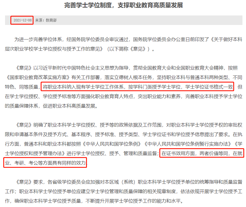 日前,國務院學位委員會辦公室印發了《關于做好本科層次職業學校學士學位授權與授予工作的意見》,明確了職業本科學士學位授權、授予等的政策依據及工作范圍,對職業本科學士學位授予權的審批權限和申請基本條件及授予方式、基本程序、授予標準、授予類型、學士學位證書和學位授予信息提出了要求。