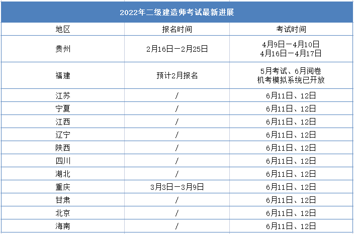 目前,已經(jīng)有13地官宣二建考試最新進(jìn)展,12地明確考試時間,2地確定報名時間,匯總?cè)缦拢?br />