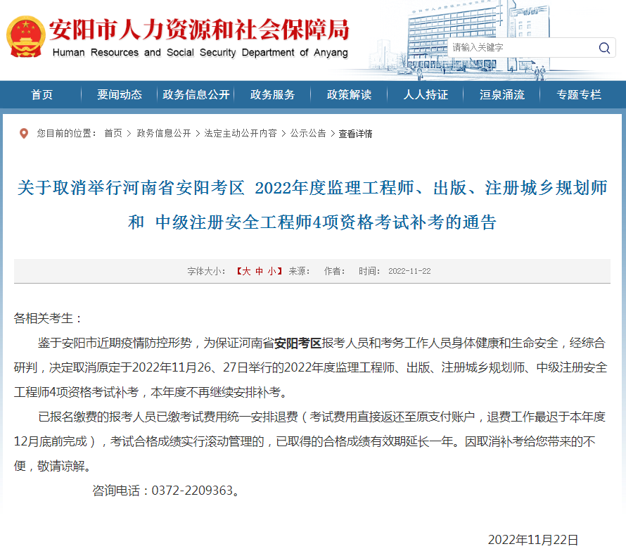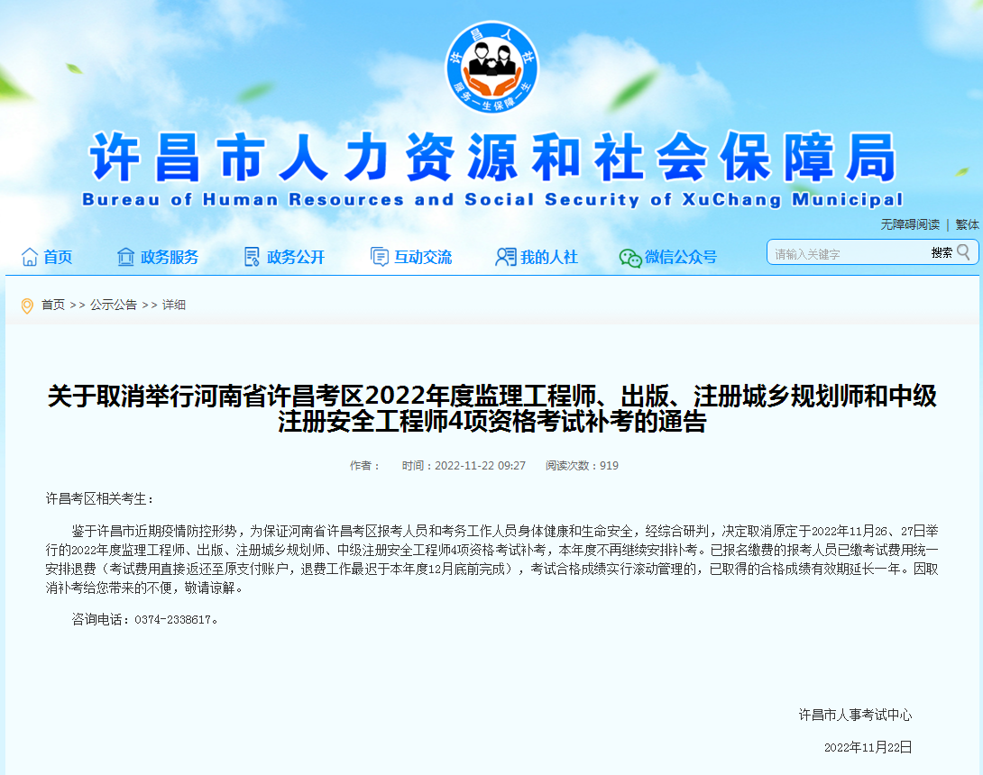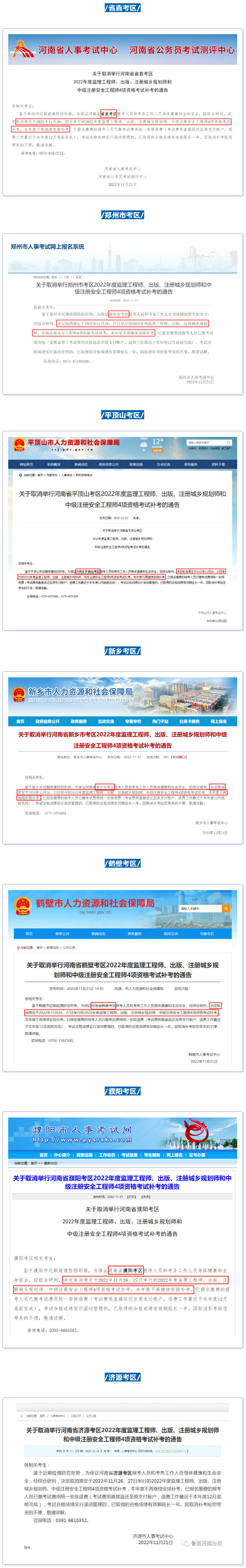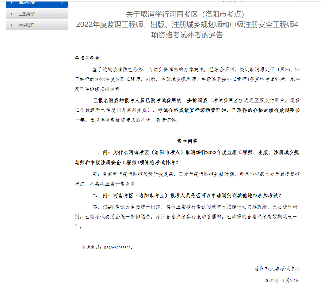 河南省省直、鄭州市、平頂山、新鄉、鶴壁、濮陽、濟源、洛陽、許昌、安陽、三門峽相繼宣布取消舉行2022年度監理工程師、中級注冊安全工程師等4項資格考試補考。