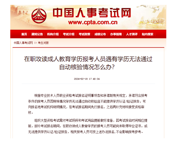 近日,人事網(wǎng)發(fā)了一篇答疑公告:《在職攻讀成人教育學(xué)歷報考人員遇有學(xué)歷無法通過自動核驗情況怎么辦?》,一起來看看吧!