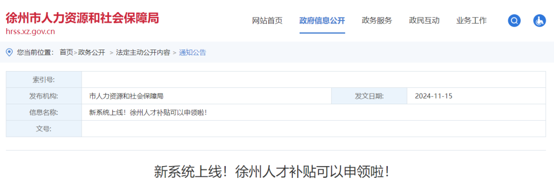 近日,徐州市人力資源和社會保障局發布通知:正式官宣新系統上線,徐州人才補貼可以申領了。