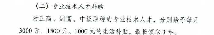 2023年11月1日后新來徐州市區企業就業參保的,40周歲以下(含40 周歲)具有正高級、副高級、中級職稱的專業技術人才,分別給予每月3000元、1500元、1000元的生活補貼,最長領取3年。