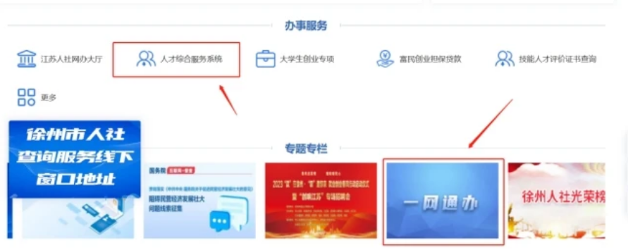 1.用人單位電腦端使用瀏覽器搜索“徐州市人力資源和社會保障網”(http://hrss.xz.gov.cn/),點擊官網首頁最下面“人才綜合服務系統”或圖標“一網通辦”后,選擇對應入口進行登錄。