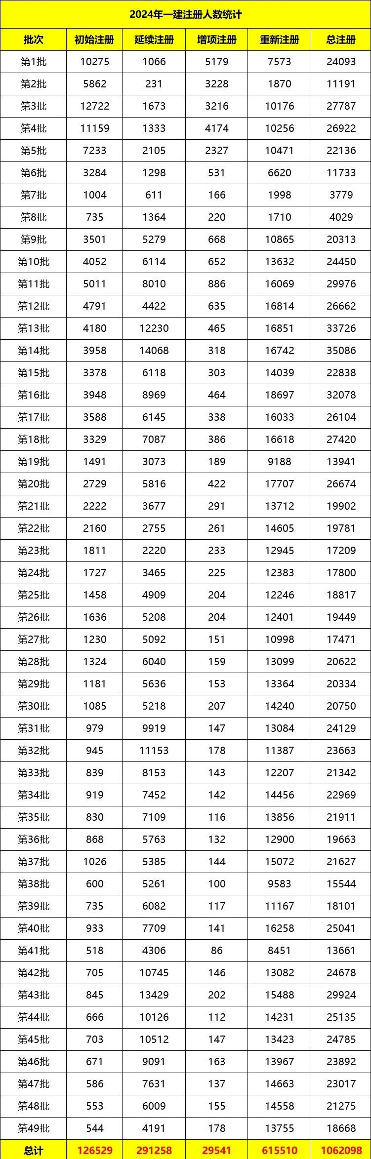 截止目前,住建部共公布了1-49批一建注冊人員名單,總共1062098人通過注冊。