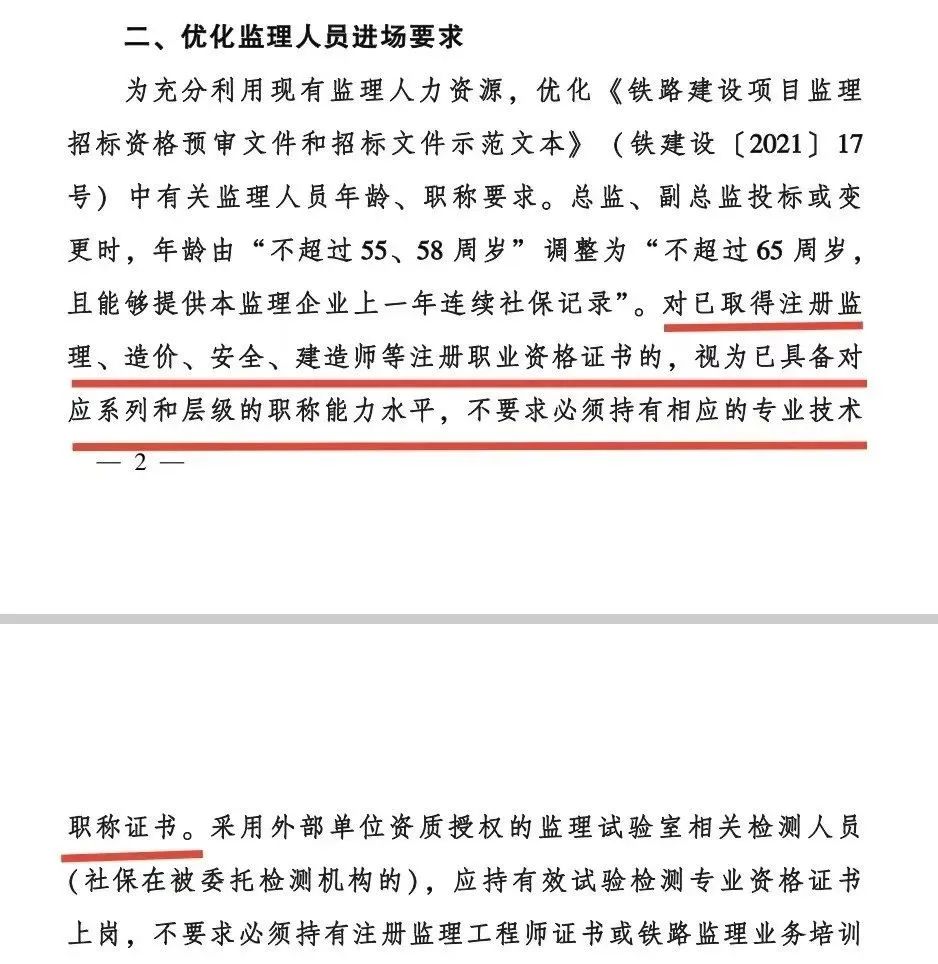 近期,國鐵集團發文:對已取得注冊監理、造價、安全、建造師等注冊職業資格證書的,視為已具備對應系列和層級的職稱能力水平,不要求必須持有相應的專業技術職稱證書。
