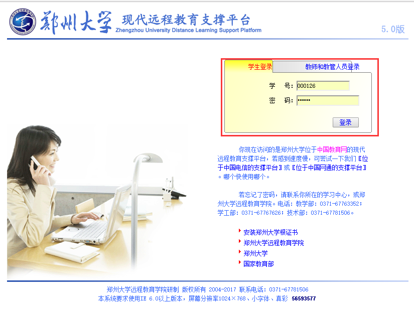 網(wǎng)上考試平臺(tái)學(xué)生登陸需要從鄭州大學(xué)現(xiàn)代遠(yuǎn)程教育支撐平臺(tái)中跳轉(zhuǎn)。在瀏覽器地址欄中輸入http://dls.zzu.edu.cn/,進(jìn)入鄭州大學(xué)現(xiàn)代遠(yuǎn)程教育支撐平臺(tái),在頁面的登錄框點(diǎn)擊“登陸”按鈕,鄭州大學(xué)現(xiàn)代遠(yuǎn)程教育支撐平臺(tái)首頁登錄如下圖所示: