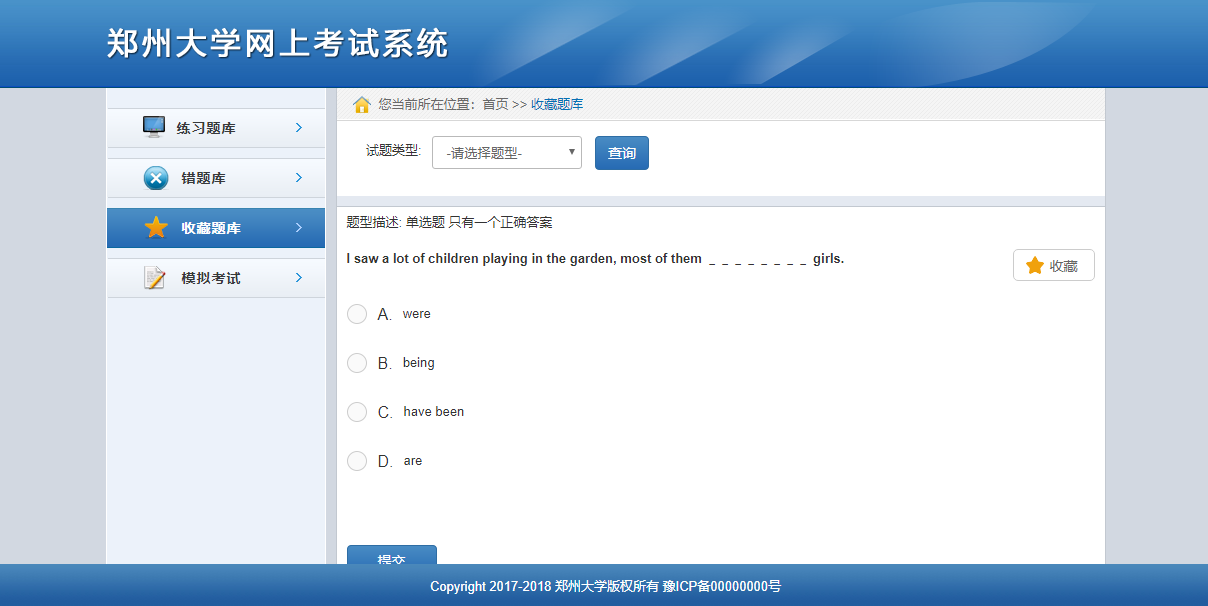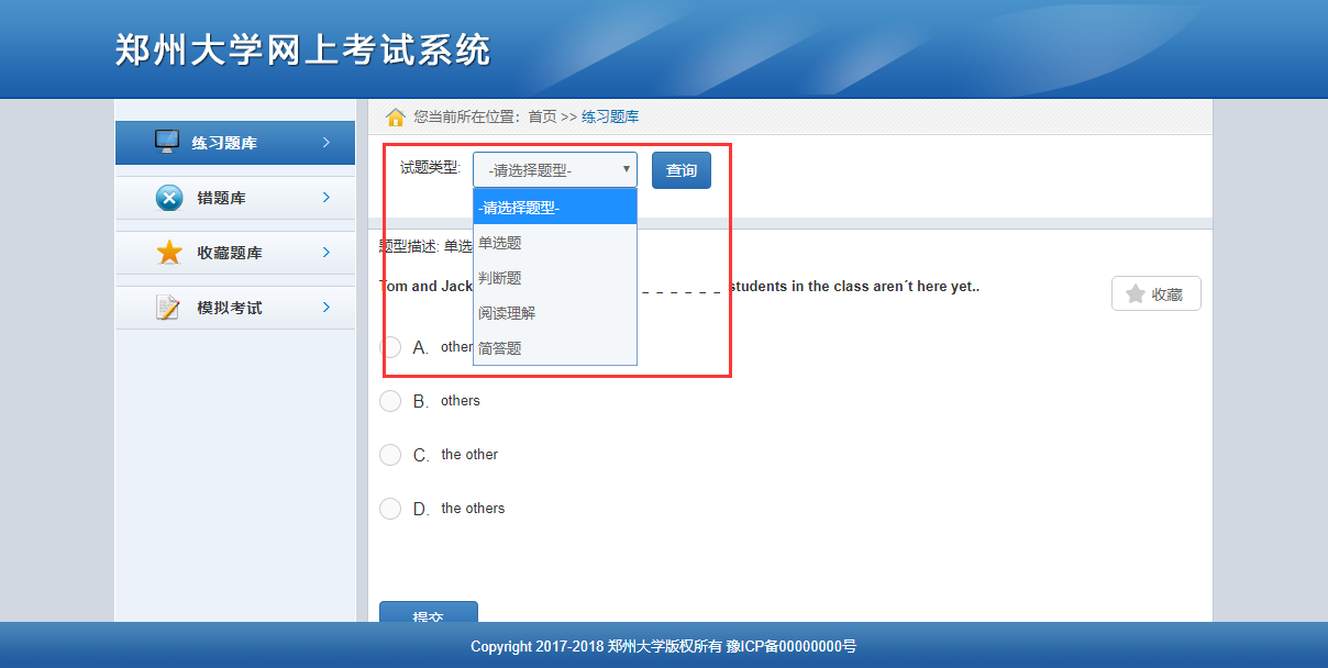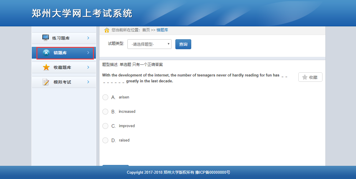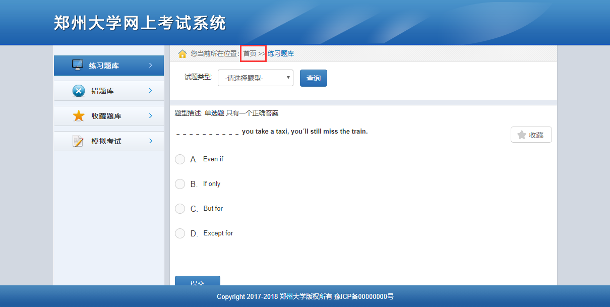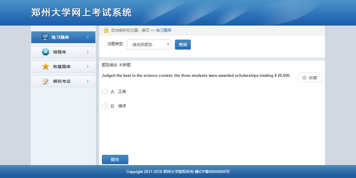 在線練習(xí)頁面主要包括“練習(xí)題庫”、“錯(cuò)題庫”、“收藏題庫”和“模擬考試”四部分,如下圖所示:
