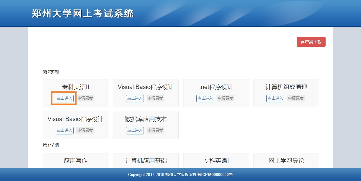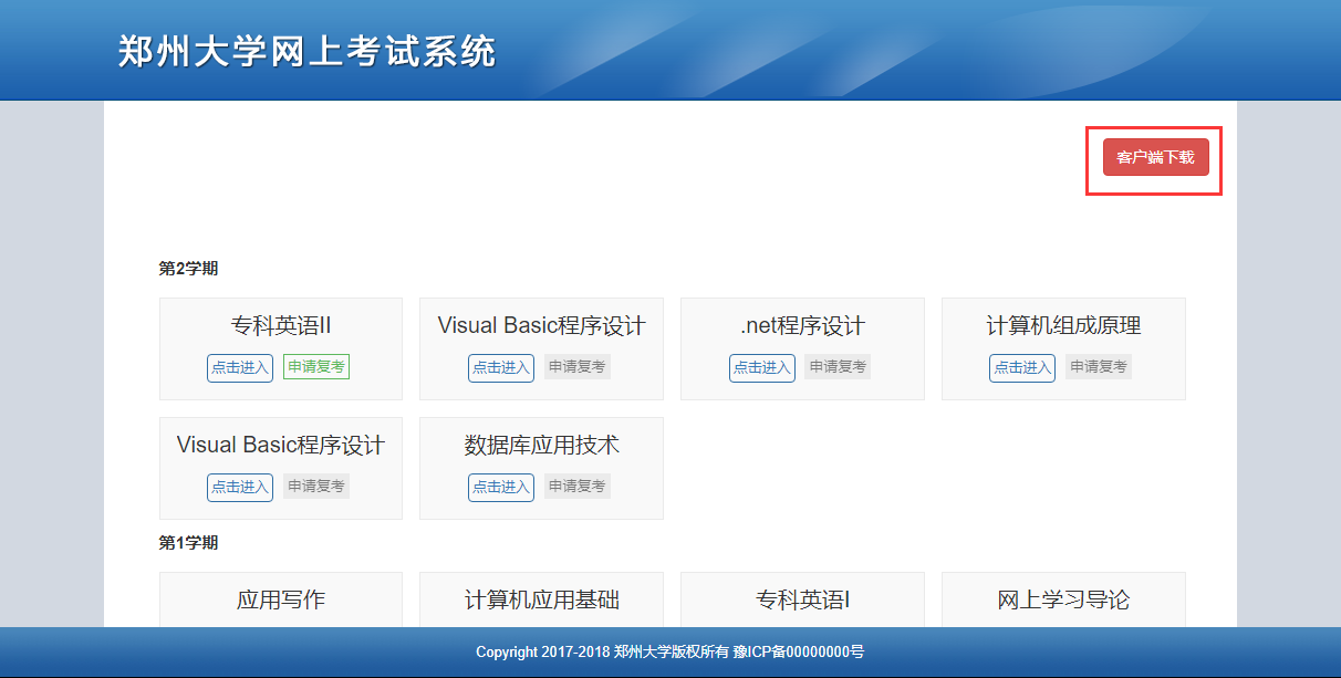 系統(tǒng)主要分為兩大部分,“在線練習(xí)”頁面和“在線考試”。在線練習(xí)部分采用網(wǎng)頁形式進(jìn)行,在線考試需要下載客戶端并安裝,在客戶端內(nèi)進(jìn)行考試。首頁如下圖所示,有學(xué)生課程列表和客戶端下載功能。