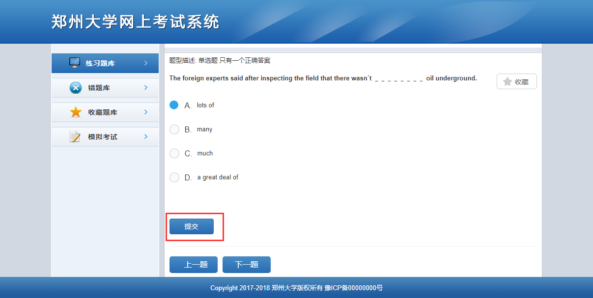 學(xué)生在試題練習(xí)過程中,可通過試題后方【  收藏】,該道試題會(huì)自動(dòng)存入收藏題庫中,供學(xué)生反復(fù)練習(xí)。收藏題庫中的試題可通過再次點(diǎn)擊【  收藏】按鈕取消收藏。收藏題庫練習(xí)采用單題練習(xí)形式,可通過點(diǎn)擊【上一題】【下一題】進(jìn)行試題切換。如下圖所示: