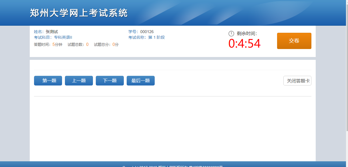 模擬考試頁面與正式考試一致,展示考生信息,考試倒計(jì)時(shí),學(xué)生可模擬開啟/關(guān)閉答題卡,第一題,上一題,下一題,最后一題,交卷,提交成績(jī)等操作,學(xué)生可通過模【擬考試】練習(xí)考試時(shí)真實(shí)場(chǎng)景。