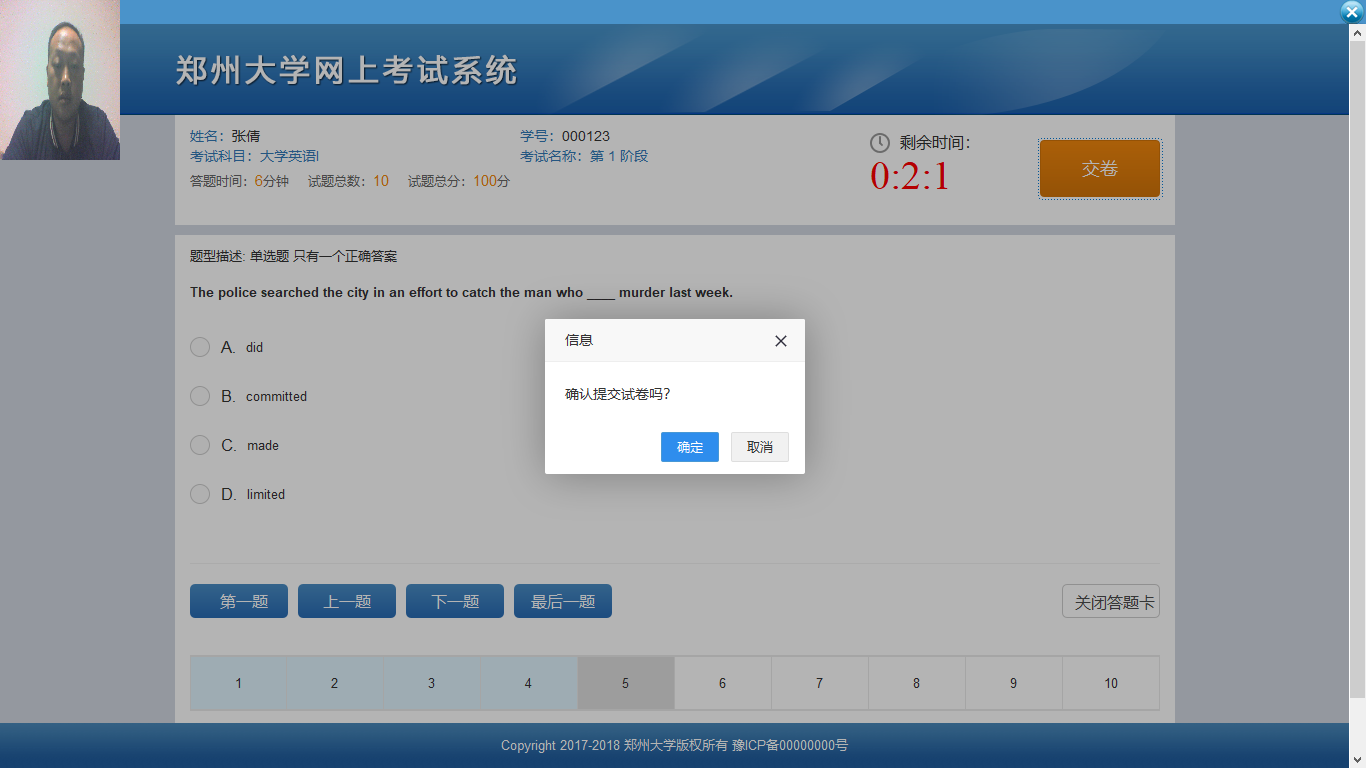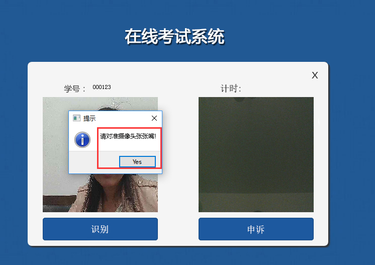 進(jìn)入考試系統(tǒng)后,面部識(shí)別程序會(huì)全程監(jiān)控考生行為,屏幕左上角為監(jiān)控畫面。如果考試過程中出現(xiàn)異常情況(不是本人,多張人臉,沒有人)時(shí),系統(tǒng)會(huì)給出相應(yīng)提示,多次比對(duì)不通過的,系統(tǒng)會(huì)自動(dòng)退出當(dāng)前考試,本次考試作廢。如圖所示: